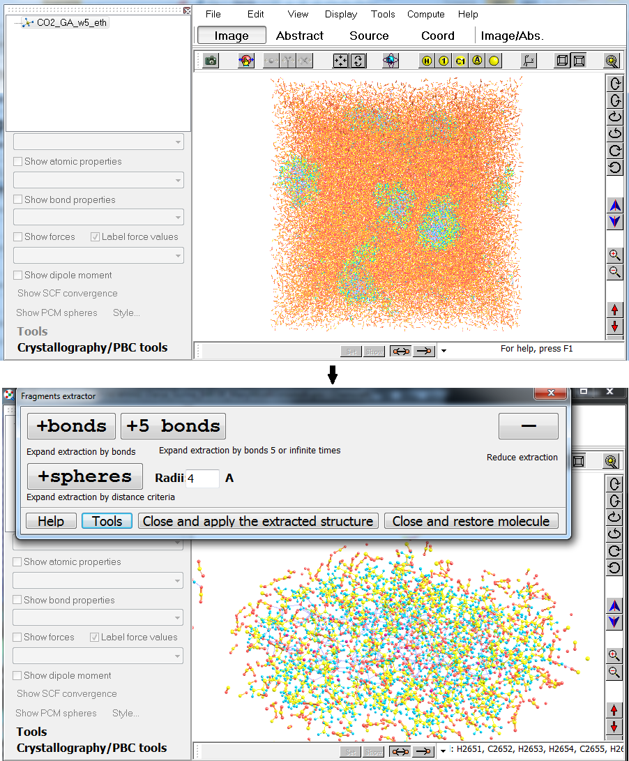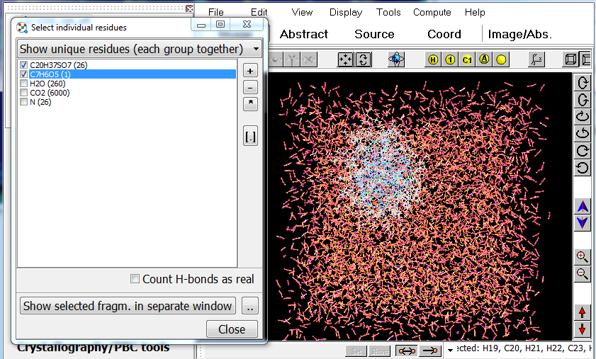 5. Chemcraft has the "Fragments Extractor" tool for both crystallography and molecular dynamics calculations (with PBC cells): firstly the program duplicates the atoms in your cell to build 3*3*3 supercell, then extracts a fragment of this supercell by atoms you have selected. For example, if you have a system containing several micelles in a solvent, you can firstly select all micelles via "Tools/Divide current structure tool", then select one of the micelles via "Edit/Flexible selection options/Selection with rectangle options/Keep selected...", and then apply the Fragments Extractor ("Crystallography/PBC tools/Additional/Show structural subunit...") so you will be able to see only the atoms of the chosen micelle and adjacent atoms: