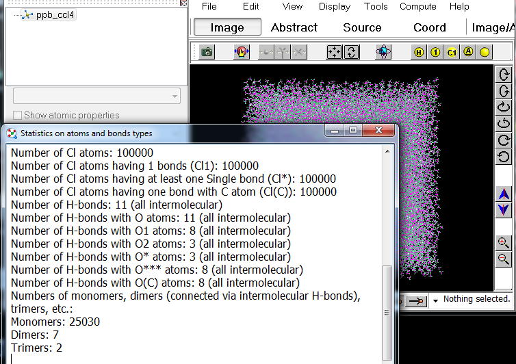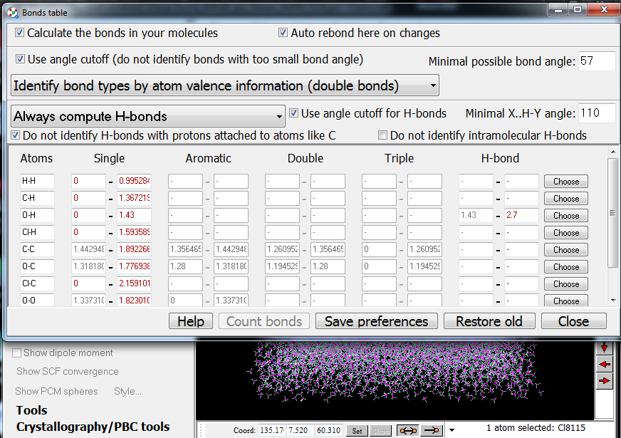 8. Molecular dynamics researchers often need to analyze the network of H-bonds in their systems (e.g. the number of dimers formed by H-bonds). With Chemcraft, such analysis can be made more efficient with manual setting of the parameters used to identify the H-bonds - distance and angle criteria, an option to exclude intermolecular H-bonds or the H-bonds with H atoms attached to atoms like carbons, etc.: