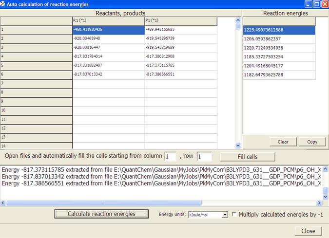 38) Chemcraft can quickly compute the energies of reactions for a row of homologues. This utility is evoked via "Tools/Simple utilities/Calculate the energy of a reaction" menu item, then the button "Auto fill form". When using this tool, the user iteratively chooses a series of output files in "open file" dialog box, and Chemcraft automatically extracts the optimized energy from each output file, and then the reaction energies are computed. Note that Chemcraft extracts the energy from the optimization step with minimum energy, and this energy can be slightly lower than the final energy from the last optimization step: